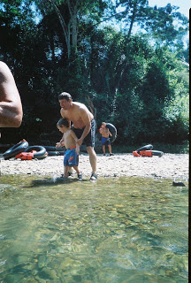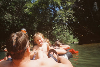After I got on the tube they handed Nathan to me. He rode with me part of the way and then with Tim part of the way. Here he’s riding with Tim. Notice we didn’t have him wear his life jacket. The water was not fast moving and it was very clear so we thought it would be just fine to have him not wear it. It made it much easier to have him ride on your lap when you didn’t have the big bulky life jacket on top of a wiggly 3 year old (LOL).