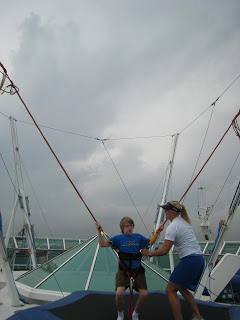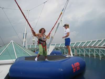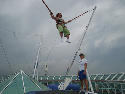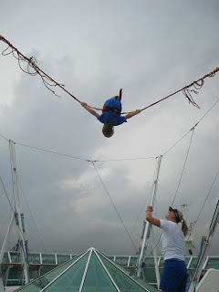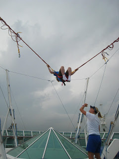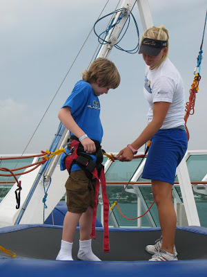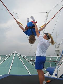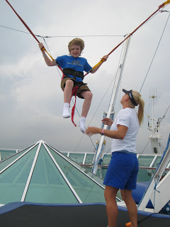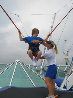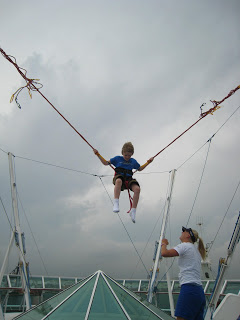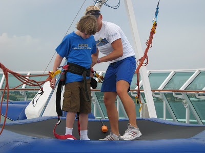 This ship had two main outdoor type activity things… The Rockwall and the Bungee Trampoline. None of the kids did the Rockwall this time, but Josh did the Bungee Trampoline a few times. Above was his first time getting a look out at the open water from aways up and off the ship deck!