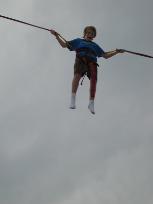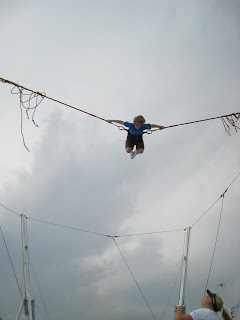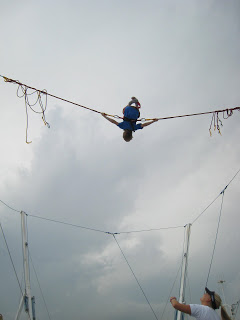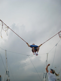 Then, below, she sent him sailing into the air… when he started to come down she would pull on him to put some extra force into the jump that would send him back up in the air again. She holds this little control things that somehow adjusts the cords and tightens them up for the “bungee” effect.
