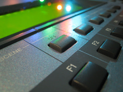 Here is a picture of the buttons for the computer part of the keyboard I play at church. The green part is the screen that shows all of the settings. I’ll describe that more in another post about worship team practice later in the week.