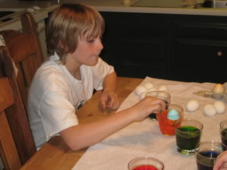 Josh with his eggs… patiently coloring each end with a different dye. Emily liked double dipping hers. She’s quite creative. Nathan wanted MORE EGGS! Next year we’ll have to double the number we color.The kids had a LOT of fun coloring Easter eggs this year. Amanda wasn’t home to participate …