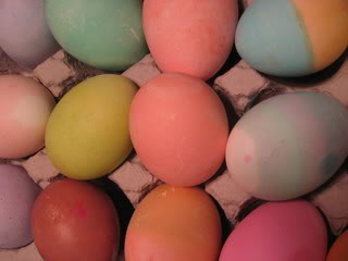 Eggs, eggs, eggs. We boiled two dozen eggs for coloring. Here are a few before we get started.