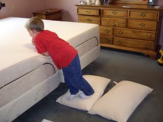 Who in their right mind would call the boys to come visit specifically for the task of WALKING on their bed? I’ve never heard of such a thing. I guess it depends on what type of bed you buy (LOL)! I can just see the wheels turning in Nathan’s little …