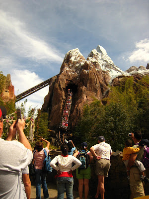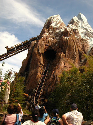 Josh did NOT want to go on this ride. He had seen the promotional video on the Disney World website before we left home and that was enough to scare him off… but he had to stick with us and none of us wanted to give up our place in line and not ride the ride, although one of us would have if he absolutely refused to go. He went and I think he was glad to have conquered it when it was all said and done. Here you can see the little train going up into the mountain and in the next picture you see it coming down the mountain.
