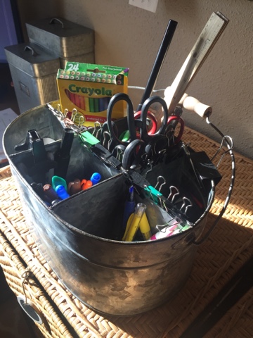 This metal bucket with dividers is one of my most favorite office organizing tools!! In fact, I would venture say it’s one of a dozen things I would consider “office essentials.” It has six areas for keeping a variety of office essentials neatly organized! This is what I keep in …