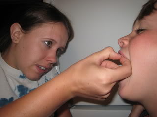 Josh has one stubborn baby tooth that has refused to come. He has been wiggling it for MONTHS. I have pushed and pulled on it. Tim has tried to remove it with dental floss. Nothing was working. So, Amanda decided to try pulling it. She wiggled and pulled. and wiggled …