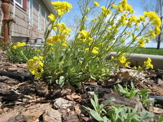I don’t remember what these are called, but I’m guessing Debbie will let me know! I missed the 1st sign of spring – a few tulips that managed to poke their heads up through the landscape fabric and rocks that we put down last year.