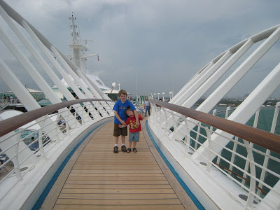 Before heading out there is a mandatory fire drill. Sure glad that cruise ship that sunk recently didn’t sink BEFORE we went on our cruise…. that would have scared the kids, for sure. Here we are all getting our life jackets on in our room. That’s where they are stored, …