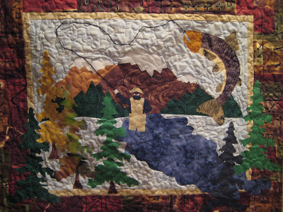 This a quilted wall hanging that Tim’s mom made for his birthday a few years ago. It hangs in our living room on the wall that goes upstairs. Like the other things in our living room, it adds to the lodge look so we can at least dream about those …