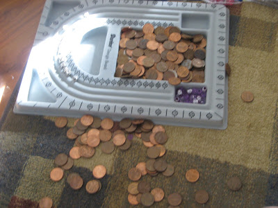 OOur annual counting of the pennies! The kids like to go through all of our change and see how much it adds up to each year. They always hope there’s enough to go do something fun! I’m not sure why they decided to use Emily’s jewelry making organizer for this …