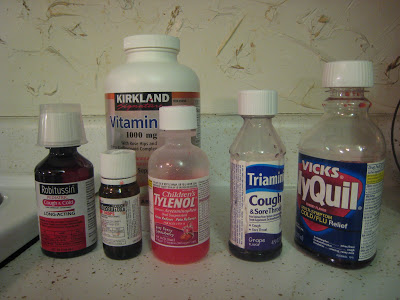 Aweek ago Monday, Nathan came home sick… coughing, runny nose, watering/matted eyes, fever/chills, etc. We were hoping the rest of us wouldn’t catch it, but we did. Everyone has their own preferred medication… so our counter looks like the local pharmacy right now. I’m the only one who doesn’t take …