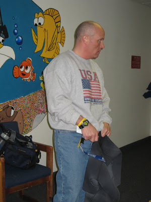 These pictures were taken during the classroom portion of our test. At this point, there were 6 of us… above you might have noticed there were only 5. Amanda decided to exercise “extreme caution” and has decided to snorkel instead of scuba. She has issues with “breathing.” She passed the quizzes without a problem and I’m sure she would have done just fine on the test. We didn’t want to push her to do something she wasn’t comfortable with… so she didn’t go to the pool portion.