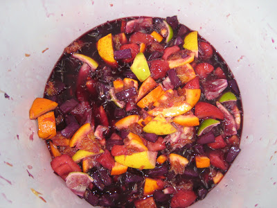 The night before the Fiesta, my mom, mil, Emily, and I cut up almost 10 gallons of oranges, lemons, limes, and strawberries for the virgin Sangria. We also mixed in pineapple which turned a really dark purple because it’s soaked overnight in grape juice. The first picture is before it soaked and the second picture is after everything has soaked awhile.