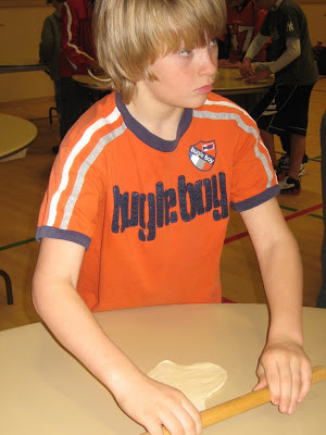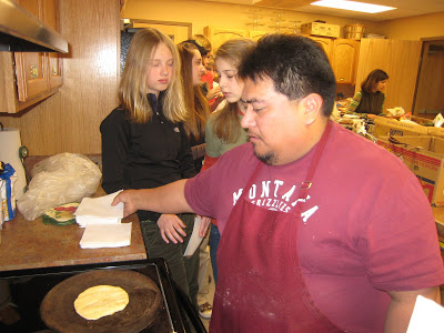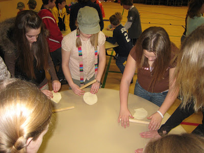 We have three Spanish teachers who helped organize the Fiesta. One of them made arrangements for a local tortilla making family to come and demonstrate how to make authentic tortillas. Here Josh is trying to get his to resemble the right shape.