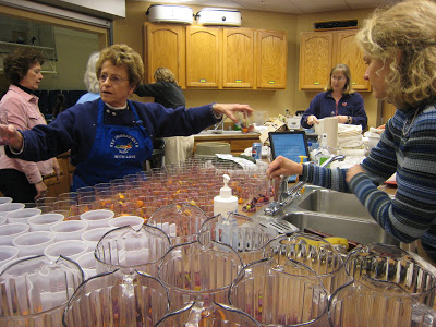 In other parts of the kitchen, the other grandmas.. this is Tim’s mom on the left with her long time friend from the previous picture on the left…..were making Chalupa which is a Mexican Stew. They cut up over 30 pounds of pork, an entire Costco sized bag of onions, 3 Costco sized bags of avacados, pounds of tomatoes, etc. There were 11 crockpots full of Chalupa. Here everyone is helping get the Sangria in the cups and to the tables.