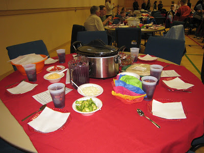 This is one of those events that was organized, but every single minute detail was not. We had a bare bones budget so we didn’t purchase any decorations, table coverings, etc. We asked everyone from co-op to bring what they had and we would figure out what to do with it all that day. You can see by the looks of the stage that it all worked out just fine. And, we had plenty of things to use to decorate the tables as well. Here’s one of the tables. Every table was different since we used what people brought and no two things were alike.