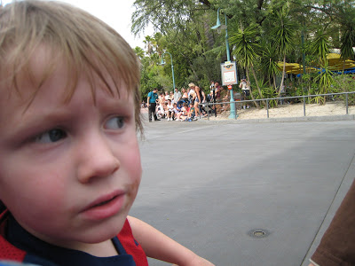 We split up for this 1/2 of the day. My brother and both grandparents stayed at Epcot to see a few of the countries. Tim, the girls, and our friends all went on MGM rides which Nathan couldn’t do and Josh didn’t do. So, the boys and I wandered around and looked at a few things then decided to watch this parade. We were a little late deciding to watch it so I wasn’t sure we would find a spot on the street where Nathan would even be able to see. I also knew we only had a short amount of time to get from the parade to the restaurant where we had reservations at 3:40. We decided to go to the start of the parade and we were fortunate to find a spot right in front where we could all sit down and watch the parade.. and as soon as it was over we followed behind the last car through the winding street until we got to a place where we could cut across and get to the restaurant. We got there just in time for dinner so it worked out great. Here the boys are eagerly anticipating the start of the parade.