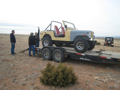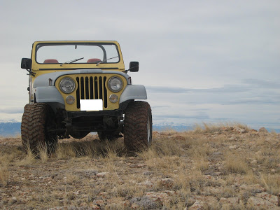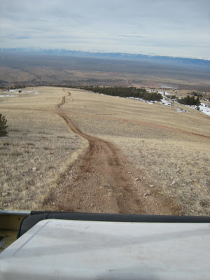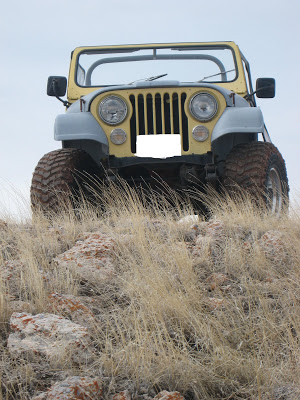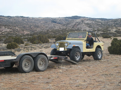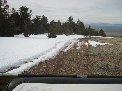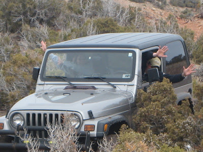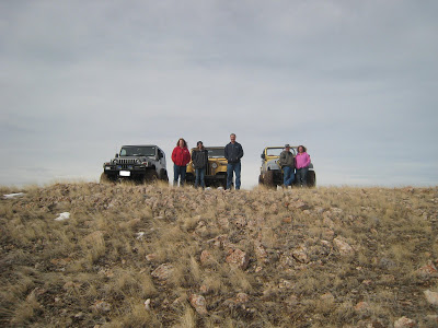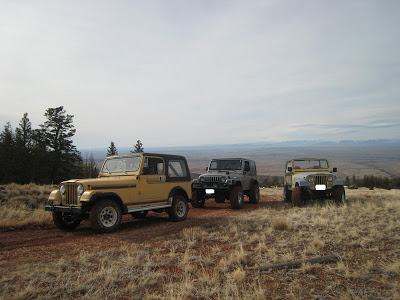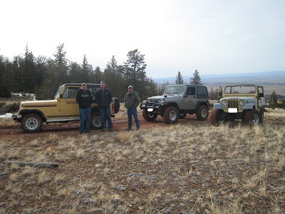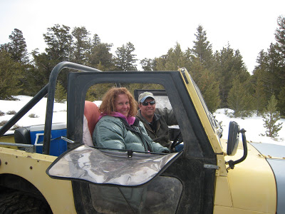 A week after we returned from vacation some friends of ours invited us to go four wheeling with them up in mountains. It was supposed to be pretty warm (40’s which is warm for the middle of March here where we live) so it sounded like a nice opportunity to get out of the house for a few hours. First we met for breakfast. You can see the three JEEPS above. The other people were *driving* their JEEPS. Not us, we have to pull ours behind our pickup until we get to the mountains… something about the tires being too big to run on the highway.