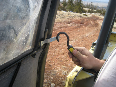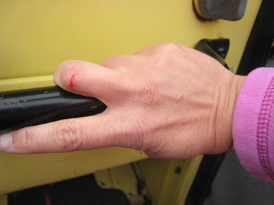 Remember the hook and bungee strap we have to use to secure the door? My finger got caught in it! OUCH!