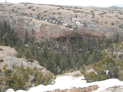 There is a big cave down there if you look closely in the middle of the photo and behind the trees.