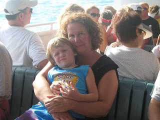 Josh LOVES to feel the spray of the water coming up the sides of the boat.. and the wind in his hair! He loves anything outdoors.Nathan standing close to Tim as we’re getting ready to unload. We wouldn’t want him to get lost in the crowd. Notice Tim holding his shirt.We only had about 20 minutes to spare after our excursion so it didn’t leave much time for shopping. I wanted to look around a little bit, but I think everyone else was worried about catching the tender. There was supposed to be one more after the one we took, but I suppose it’s best to not cut things too close. This is the first time that I haven’t gotten a Christmas ornament from some place that we visited. I’ll have to see if I can find one online sometime.The girls worked on their CHACO tan lines. The tender ride was a good 45 minutes or so. The tour bus that we are taking leaves at two different times and since we didn’t get on the first tender I knew we wouldn’t make the first bus and was worried about getting their in time for the second bus. But, we had reservations and we were a fairly large group so I didn’t really think they would leave without us. They didn’t. After we reached land we found the bus and were on our way to the mountains. See next blog entry.On the way back to the ship the tender was pretty full and quite a few of us ended up standing.