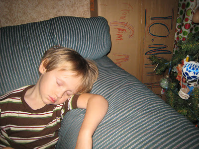 Then there are the moments when he sits down to look at the tree and falls alseep wondering what’s in all of those packages especially the BIG one that was too big to wrap. Josh and Emily drew on it instead and Nathan LOVES the box! He likes to sit on the love seat right by the tree and dream about what’s in the box. He has NO IDEA.